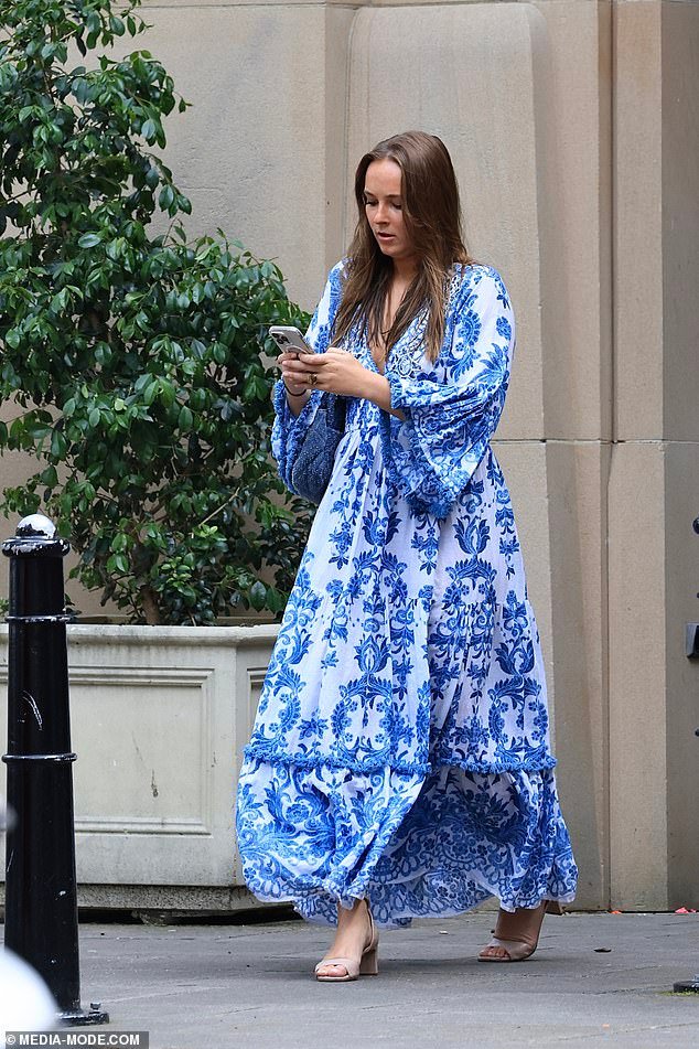 Viņa papildināja savu izskatu ar smilškrāsas papēžu pāri un atstāja savas brunetes, izbaudot jautru dienu kopā ar draugiem.