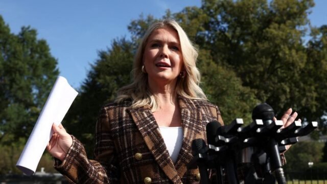 Baltā nama preses sekretāre Karolīna Levita uzstājas preses brīfingā Džeimsa Breidija preses informatīvajā telpā Baltajā namā pirmdien, 2025. gada 6. oktobrī, Vašingtonā. (Related Press)
