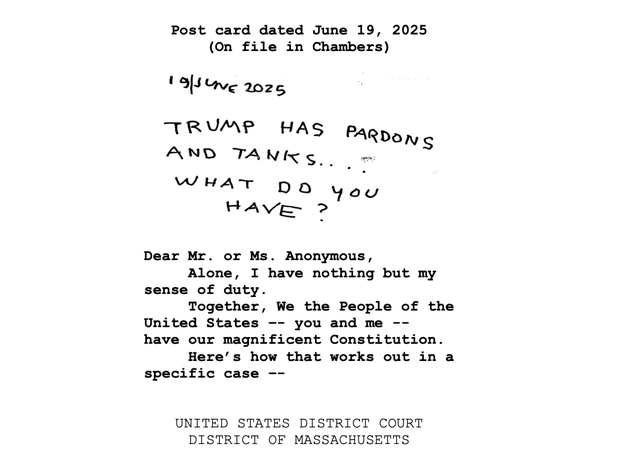 “Trumpam ir apžēlojumi un tanki … kas jums ir?” Saka pasta karti, kas datēta ar 19. jūniju un rakstīta ar rokām. Jauns atbild, ka “vienatnē man nav nekas cits kā mana pienākuma sajūta. Kopā mums, Amerikas Savienoto Valstu cilvēkiem – jums un man – ir mūsu lieliskā konstitūcija”, viņš raksta, pirms šajā lietā sniedzam savu viedokli. Pēc savas domas beigām Youngs atkal rakstīja personai, kura nosūtīja anonīmus draudus.