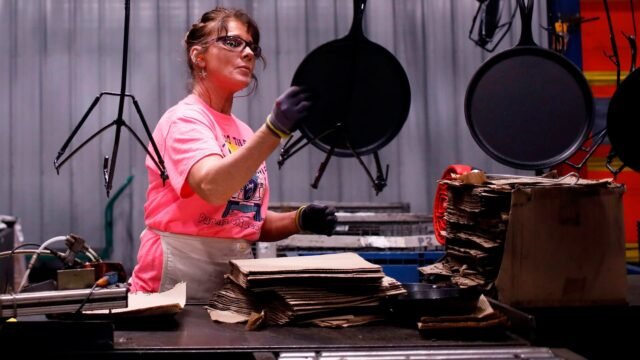 Darbinieku iesaiņo čuguna virtuves piederumi Lodge Manufacturing Co rūpnīcā Pitsburgas dienvidu daļā, Tenesī, pirmdien, 2022. gada 7. martā.