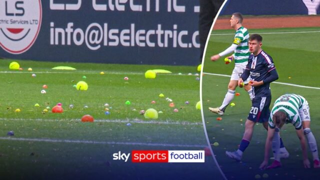 Celtic fani aizkavēja spēles sākumu pret Dandiju, izmetot laukumā simtiem bumbu, protestējot pret kluba valdi.