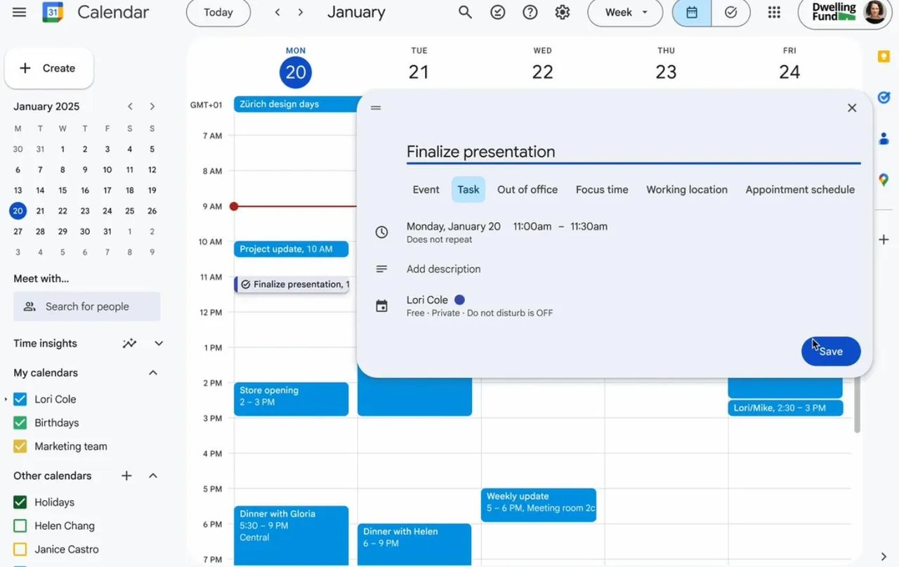Lai kaut kam atlicinātu laiku, vienkārši noklikšķiniet uz atvērtas kalendāra vietas un izvēlieties “Uzdevums”. Jūs piešķirsit savam uzdevumam nosaukumu un laiku, un, ja vēlaties, varat izvēlēties termiņu. Ja esat Workspace vai Schooling lietotājs, varēsit spert soli tālāk un izvēlēties, vai ieslēgt režīmu “Netraucēt” un automātiski noraidīt sapulču pieprasījumus, kas pārklājas ar jūsu uzdevuma laika grafiku.