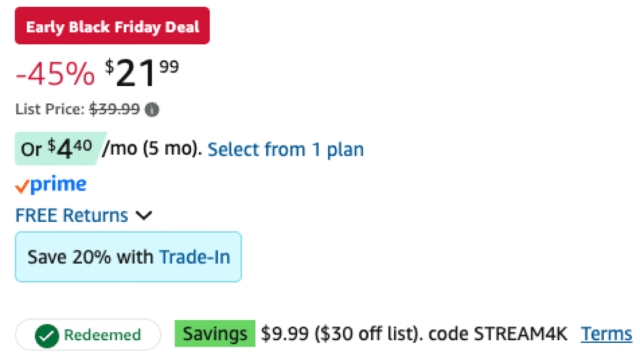 No 17. novembra Hearth TV Stick 4K Choose atsevišķiem klientiem ar kupona kodu STREAM4K vietnē Amazon ir samazinājies tikai līdz 9,99 USD. Tā ir 75% atlaide no tās saraksta cenas 39,99 USD un tās zemākās cenas, kāda jebkad ir bijusi zemes nogruvums. Bez kupona koda tas joprojām ir diezgan stabils darījums par 21,99 USD, taču 10 USD par 4K straumēšanas nūju ir patiesi nežēlīgi.