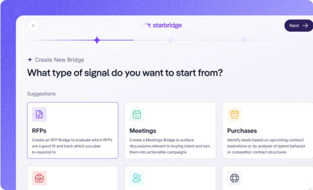 Starbridge iegūst publiskos tīmekļa datu avotus no šādiem avotiem un ievieto informāciju vienuviet. Pārdošanas komanda, kas izmanto platformu, var redzēt ranžētu punktu skaitu, pateicoties Starbridge, kurā publiskā sektora konti, visticamāk, iegādāsies jaunas tehnoloģijas, un redzēt atjauninājumus, piemēram, izmaiņas vadībā vai jaunas iniciatīvas.