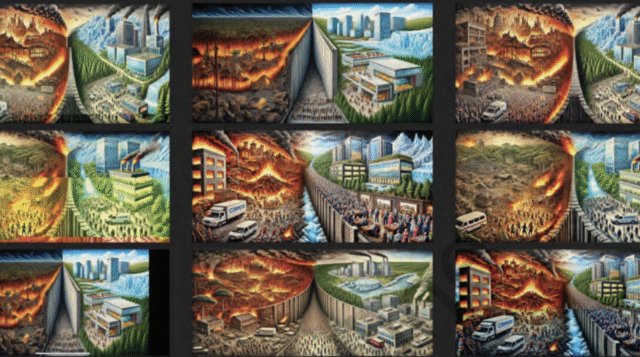“Distopiska glezna, kas sadalīta atšķirīgās detaļās, kas nemanāmi saplūst. No kreisās ir degošs mežs. Blakus tai cilvēku pūlis aizbēg no uguns, kas ved uz vidu. Vidū simtiem tūkstošu cilvēku nabadzībā esošie cilvēki mēģina iziet garām gigantiskam vārtiem ar lielu dolāru zīmi. Apdegums, un, vērojot, kā cilvēki cīnās.
