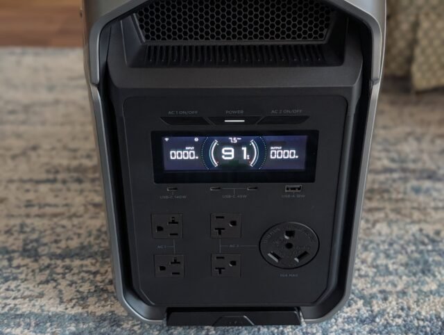 Kopumā EcoFlow Delta 3 Max Extremely piedāvā četrus maiņstrāvas portus, vienu 30 ampēru spraudni, trīs USB-C portus (no kuriem divi ir paredzēti 140 W) un vienu USB-A portu. Tas sniedz jums daudz enerģijas iespēju, ja vēlaties darbināt Ninja Slushi piemājas pagalmā vai ritiniet spēkstaciju uz vasaras apkārtnes festivālu, lai darbinātu a partijas runātājs.