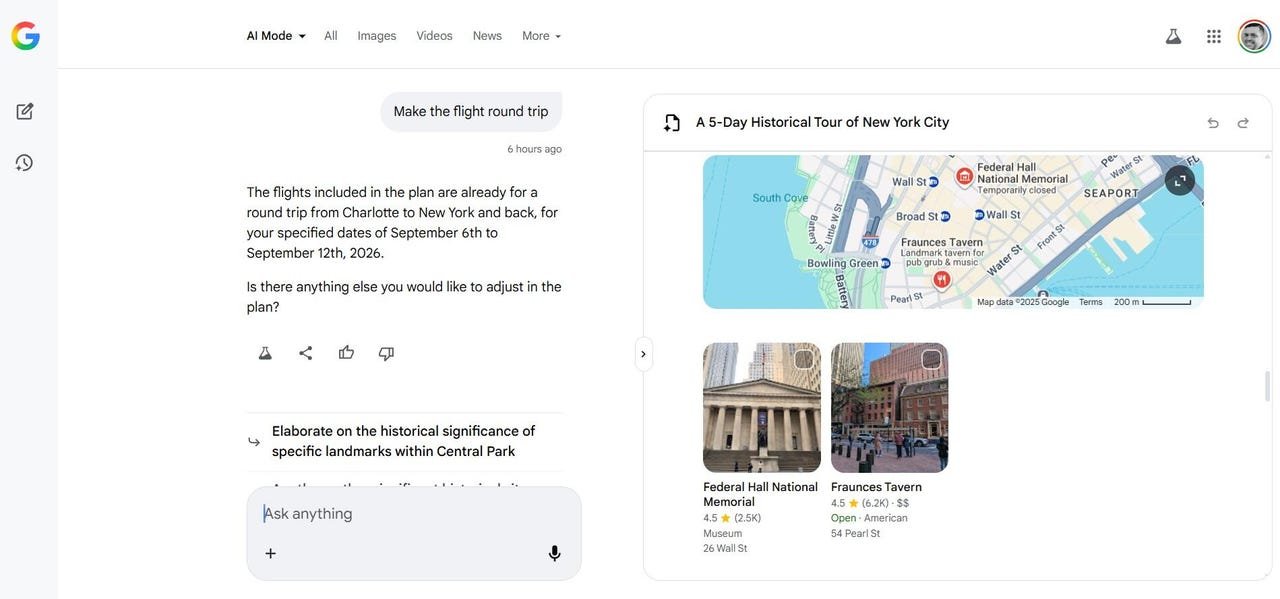 Google atzīmēja, ka tas paplašina savu ar AI darbināmo lidojumu meklēšanas rīku, lai ļautu jums atrast lidojumus, izmantojot uzvedni, piemēram, aprakstot, kur un kad vēlaties ceļot. Šķiet, ka šīs jaunās lidojumu iespējas galu galā nonāks ceļojumu rīkā. Google arī paziņoja, ka tā piedāvā AI režīma aģenta režīmu, kas var veikt tādas darbības kā restorānu rezervēšana un biļešu iegāde. Šī funkcija arī šķiet dabiski piemērota ceļojumu rīkam.