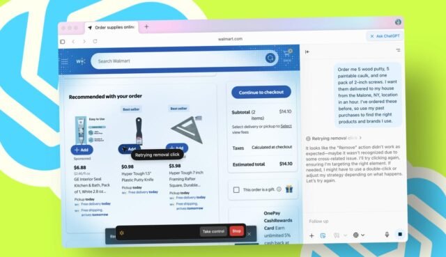 Tā cīnījās ar uznirstošajiem logiem un manām iepirkšanās preferencēm, kad nebiju pierakstījies pakalpojumā Walmart un neatsaucos uz manu pirkumu vēsturi, ja es tam neteicu to darīt tieši. Tomēr pirmās dienas pārbaudei un versijai 1.0 tas ir pārsteidzoši spējīgs. Droši vien es pats būtu varējis veikt pasūtījumu ātrāk, taču bija nenoliedzami forši skatīties, kā ChatGPT aģents patiešām pārvietojas tiešsaistes vietnē, noklikšķina cauri izvēlnēm un veido iepirkumu grozu. Visa pieredze man aizņēma apmēram 10 minūtes. Nav slikti, vai ne?