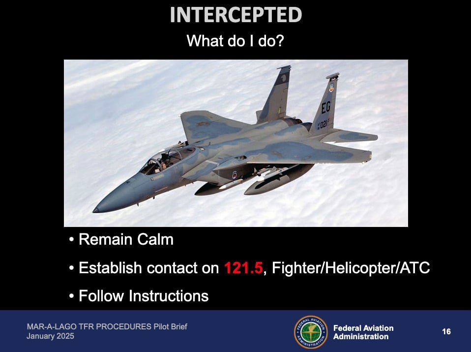 Powerpoint slaids no FAA, kurā paskaidrots, kā rīkoties, ja esat pilots, kurš ir pārtverts virs Mar-a-Lago. Ekrānuzņēmums: FAA