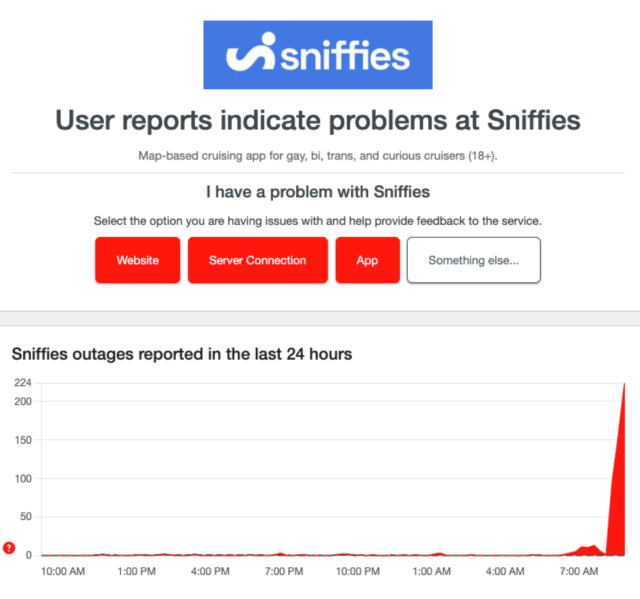 Tas kļūst sliktāks: saskaņā ar teikto nedarbojas arī cita geju iepazīšanās lietotne Sniffies Downdetektors. (Informācijas atklāšana: Downdetector pieder Zifam Deivisam, kuram pieder arī Mashable).