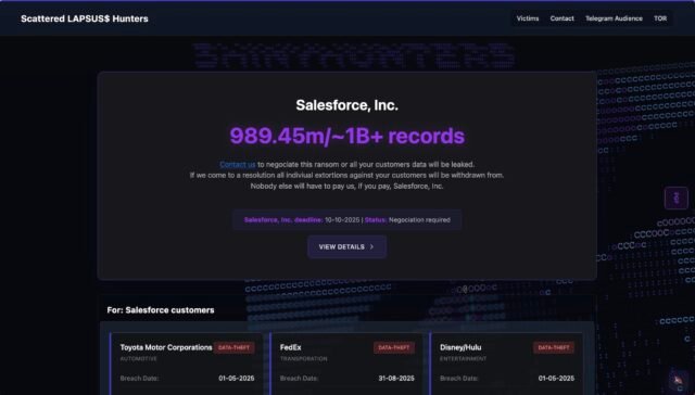 Bēdīgi slavenā angliski runājošā hakeru grupa ir izveidojusi vietni, lai izspiestu savus upurus, draudot izlaist apmēram miljardu ierakstu, kas nozagti no uzņēmumiem, kuri glabā klientu datus mākoņa datu bāzēs, kuras rīko Salesforce.