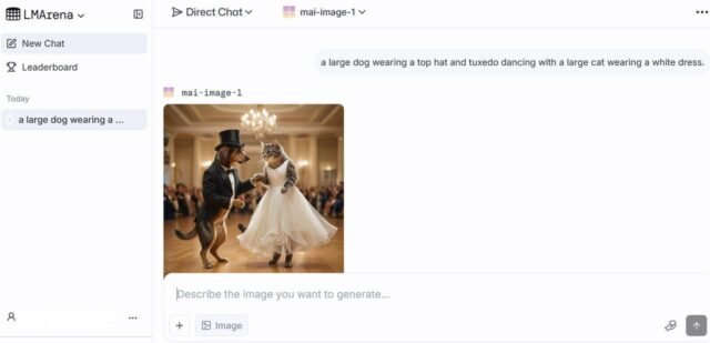 Dot mai-image-1 virpuļot, pārlūkot attēlu ģeneratora lapa LmarenaApvidū Noklikšķiniet uz nolaižamās izvēlnes augšpusē un nomainiet atlasi no kaujas (kas izvēlas modeļus jums), lai tieša tērzēšana. Pēc tam noklikšķiniet uz izvēlnes, lai atlasītu modeli, un iestatiet to uz Mai-Picture-1. Uzvednē ierakstiet attēla veida aprakstu, kuru vēlaties ģenerēt, un pārbaudiet, ko rada modelis.