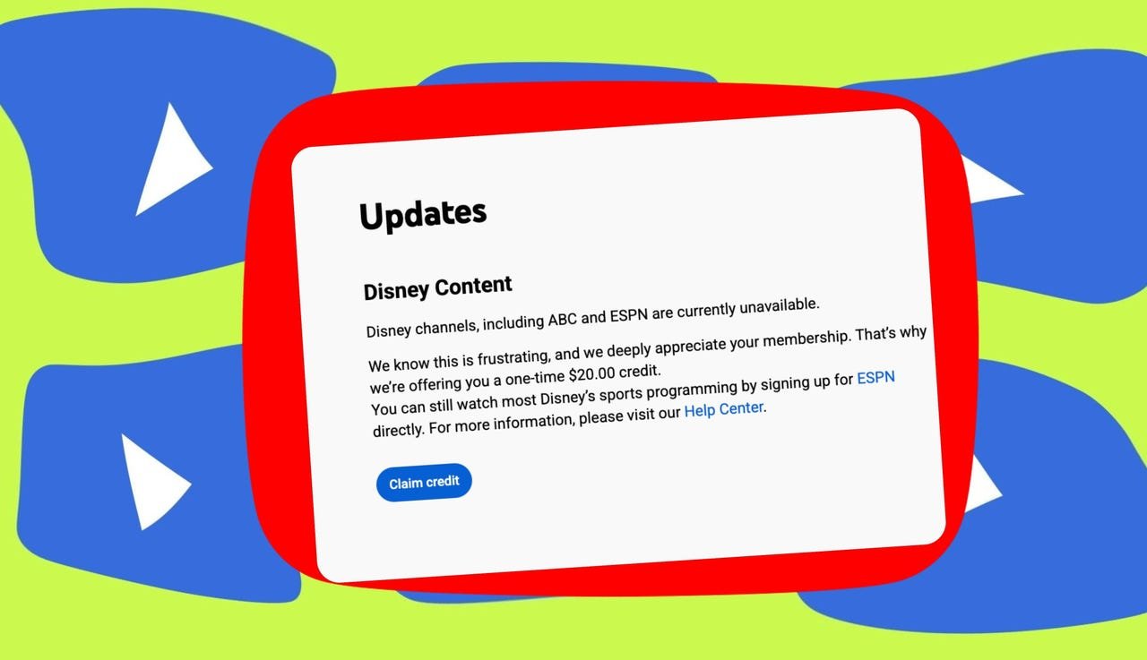 • YouTube TV lietotāji, kurus skārusi Disney-ESPN aptumšošanās, saņem kredītu.
