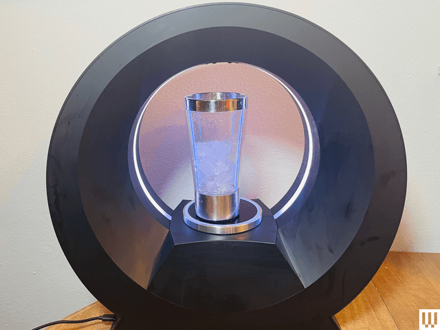 Kad tas ielej jūsu dzērienu, ierīces indikatori mainīsies no baltas uz zilu uz zaļu, kad jūsu kokteilis būs gatavs. Un ja arī esat nopircis Barsys maisītāja stikls (45 USD) Izmantojot magnētisko vērptuvi, tasīte ļoti ātri griezīs jūsu dzērienu, ledu un visu pārējo, pārvēršot jūsu tropisko dimantu daiquiri zaļā krāsā izgaismotās putās. Čau! Kvēlojošs, griežams dzēriens!