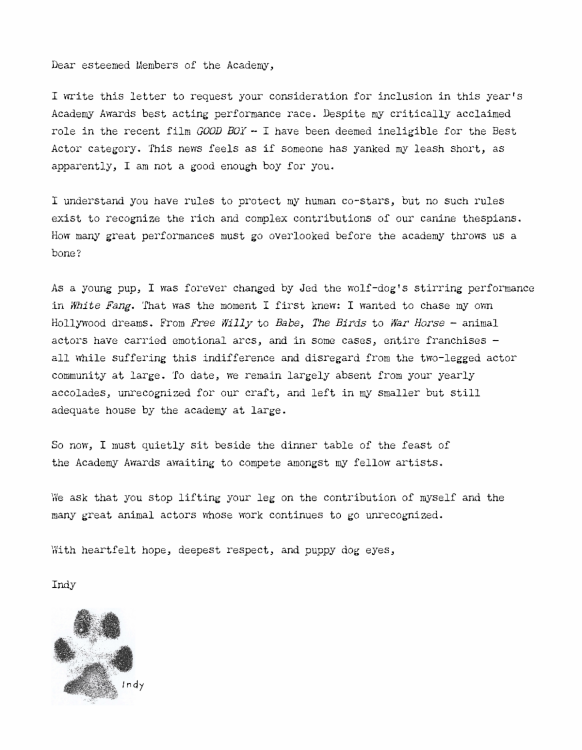 Labu zēnu zvaigžņu suns Indy lūdz akadēmijas balvas, lai viņu dzirdētu