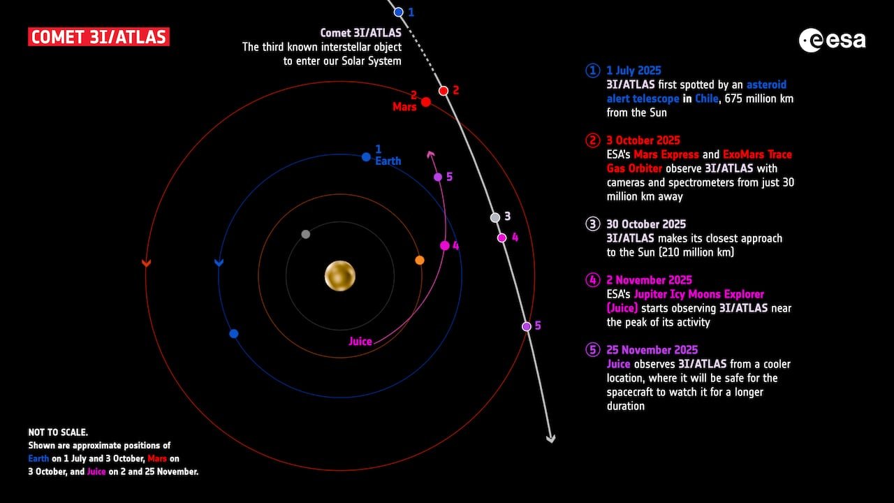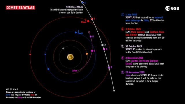Objekts nepienāks bīstami tuvu Zemei, taču 3. oktobrī tas paskrēja garām 30 miljonu kilometru attālumā no Marsa. Divi Eiropas Kosmosa aģentūras roboti, kas pašlaik atrodas orbītā ap Marsu, ExoMars un Marsa ekspresisbija vislabākajā pozīcijā, lai uzņemtu 3I/ATLAS attēlus, un atklāja izplūdušo bumbiņu — pazīstams kā koma — ar īsu asti.