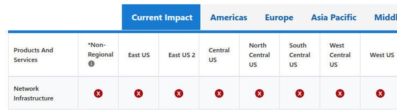 Atšķirībā no AWS kļūmes, kas, lai gan tās bojājumi bija milzīgi, aprobežojās ar vienu reģionu (AWS East), saskaņā ar Azure statuss lapa uz 13:30 ET, visi Azure reģioni nedarbojas.