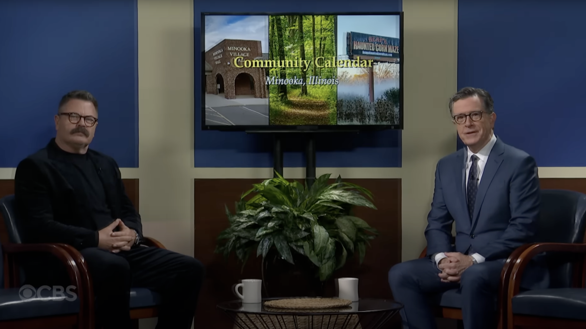 Ieslēgts Vēlā izrāde ceturtdiena, Niks Ofermens iepazīstināja Stīvenu Kolbertu ar reāliem kopienas notikumiem viņa dzimtajā pilsētā Minokā, Ilinoisas štatā, un, godīgi sakot, piesakieties mums visam.