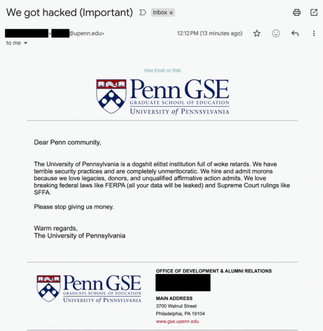 (Izpaušana: kā absolvents un bijušais universitātes darbinieks, hakeri trīs reizes nosūtīja ziņojumu uz manu personīgo e-pastu, katru no dažādām amatpersonām. @upenn.edu e-pasta adreses, tostarp viena no vecāka Penn darbinieka.)