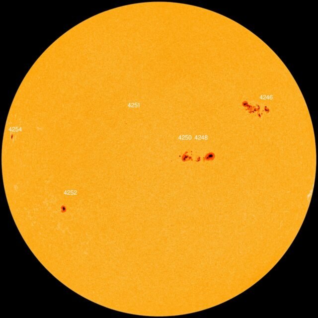 Uz saules virsmas ir vairāki saules plankumi. Viens no aktīvākajiem reģioniem ir bijis 4246. (NASA/SDO/Spaceweather.com)