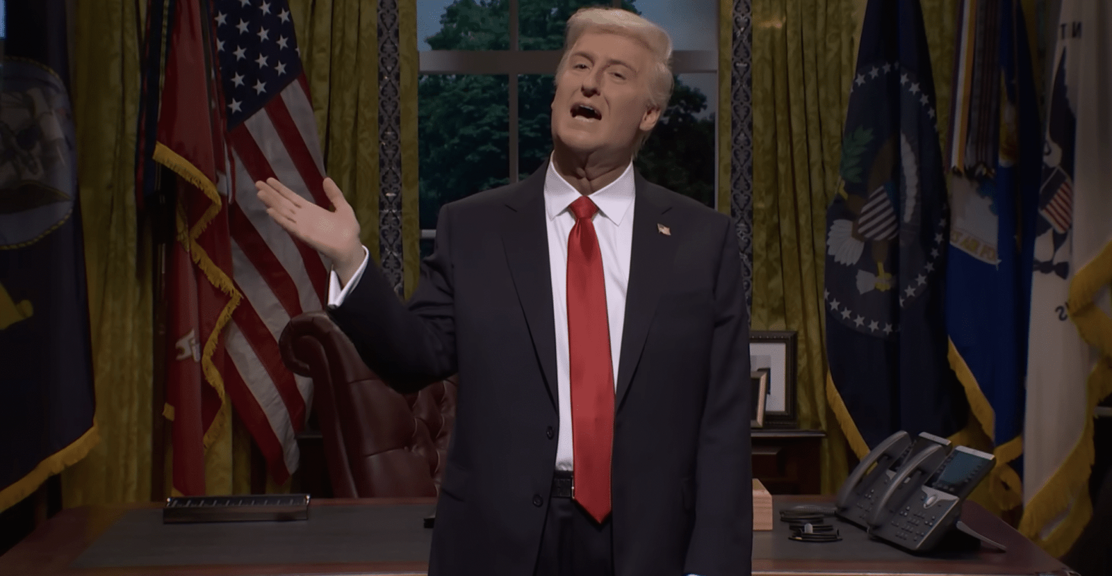 Sestdienas vakara tiešraide uzsāka savas jaunākās sezonas piekto sēriju ar mērķtiecīgu triecienu prezidenta Donalda Trampa dīvainajai uzvedībai nesenā Ovālā biroja uzstāšanās presēļaujot aktieriem Džeimsam Ostinam Džonsonam izklaidēties ar savu šausmīgi precīzo Trampa iespaidu.