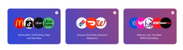 Tomēr tā vietā, lai piedāvātu noteiktu procentuālo atmaksu pēc tēriņu kategorijas, piemēram, pārtikas preces, gāze vai ēdināšana, Venmo programmā klienti var izvēlēties no atlasītajiem savu iecienītāko zīmolu komplektiem. Piemēram, varat izvēlēties zīmolu grupu, kurā ietilpst McDonald’s, TikTok Store, Uber un Uber Eats, vai tādu, kas piedāvā Amazon, DoorDash, Domino’s un Walgreens.