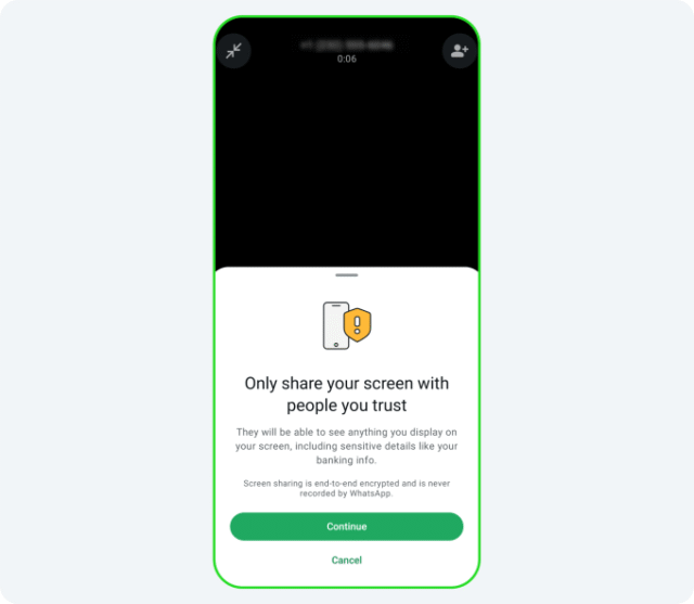 Vietnē WhatsApp uzņēmums tagad parādīs brīdinājumu, kad videozvana laikā mēģināsit kopīgot ekrānu ar nezināmu kontaktpersonu. Šo paņēmienu bieži izmanto, lai apmānītu upurus, lai tie sniegtu sensitīvu informāciju, piemēram, bankas informāciju un verifikācijas kodus, saka Meta.