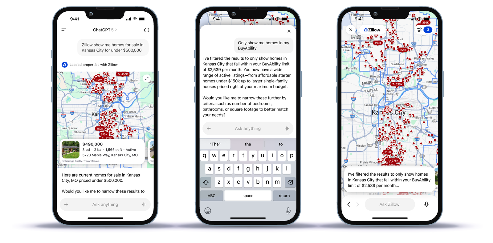 Savā 6. oktobra paziņojumāZillow teica, ka ChatGPT lietotāji tagad var pievienot Zillow lietotni populārajam AI tērzēšanas robotam un izpētīt sarakstus, izmantojot meklēšanu dabiskā valodā. Pēc tam lietotne ChatGPT ietvaros var parādīt informāciju par īpašumu ar saitēm atpakaļ uz sākotnējiem ierakstiem vietnē Zillow.